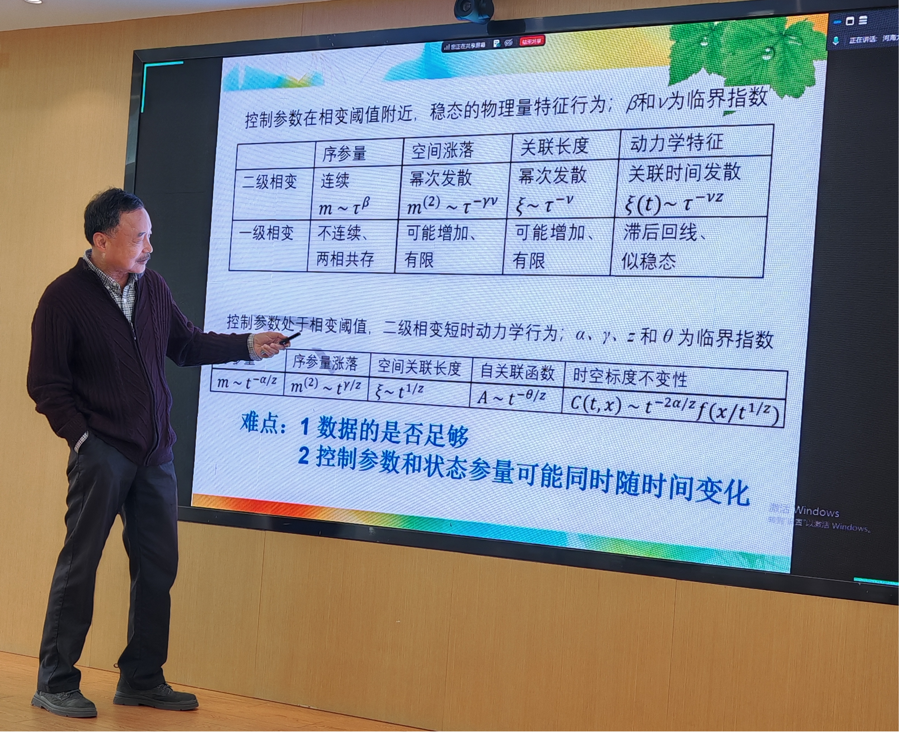 在学术分享环节,郑波教授重点探讨了相变和相变动力学的若干前沿课题。他深入浅出地讲解了非平衡态统计物理的核心概念,并着重介绍了这些理论在交叉学科——特别是海岸带临界过程(Critical Processes in Coastal Zones)中的应用与发展。随后,郑波教授系统阐述了相变理论的物理本质,重点对比了一级相变与二级相变的动力学特征。报告指出,海岸带作为陆海交互的高度动态和复杂系统,其演化过程往往表现出明显的非线性特征与临界相变行为,利用统计物理模型可以更精准地解析其动力学机制。